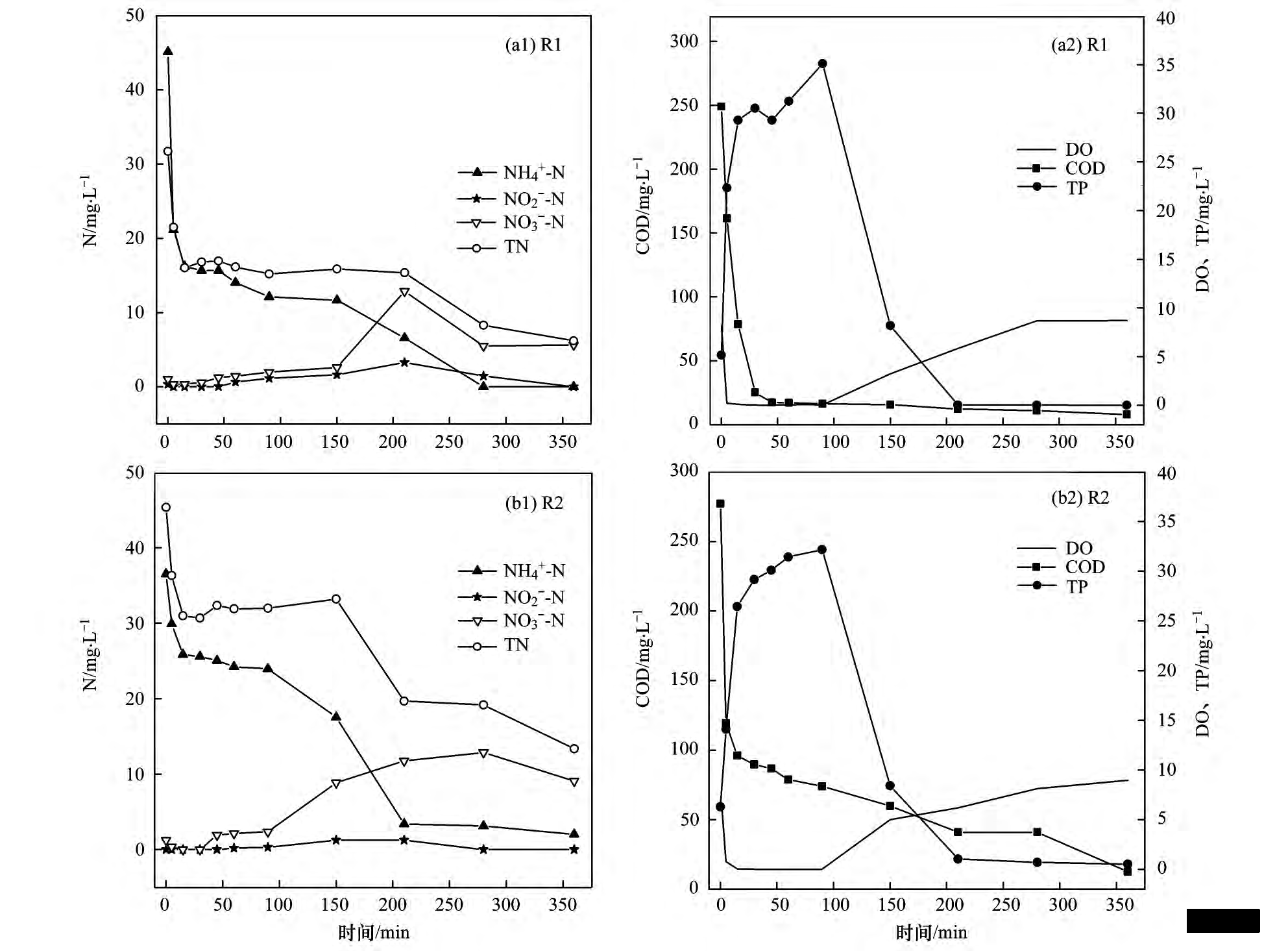 圖 6 為 R1、R2 在第 128 d 的一個典型周期內(nèi)NH + -N、NO - -N、NO - -N、TN、COD、TP、溶解氧4 2 3( DO) 的濃度變化. 厭氧階段,R1、R2 反應(yīng)器內(nèi)的DO 濃度在 0. 02 mg·L - 1 以下,好氧階段,R1、R2中 DO 緩慢增加,最終穩(wěn)定在 8 mg·L - 1 左右,反應(yīng)器內(nèi)具有良好的 A/ O 運行環(huán)境. R1 中 COD 濃度在厭氧階段下降較快,在前 30 min 已經(jīng)基本消耗,COD 由 250 mg·L - 1 降至 25. 12 mg·L - 1 . R2 反應(yīng)器進水為生活污水,在厭氧階段,由于有機物成分復(fù)雜,微生物可快速利用的有機碳源較少,所以降解速度較慢, COD 由 275. 19 mg·L - 1 降至 90. 44mg·L - 1 ; 在好氧階段,反硝化作用消耗有機碳源,COD 濃度逐漸降低至 24. 58 mg·L - 1 ,COD 得到去除. 在厭氧末期,R1 釋磷較多,反應(yīng)器內(nèi)的 TP 濃度為 35. 09 mg·L - 1 ,而 R2 反應(yīng)器內(nèi)的 TP 濃度為32. 18 mg·L - 1 . 導(dǎo)致釋磷量不同的主要原因為生活污水中含有慢速生物降解物質(zhì)和溶解性惰性物質(zhì)等不利于聚磷菌利用的有機物,在厭氧階段不能夠完全降解,降低了釋磷量. 在周期實驗出水中,R1、R2 出水均未檢測到NH + -N、NO - -N,出水NO - -N濃度分別為 5. 65 mg·L - 1 、9. 67 mg·L - 1 ,產(chǎn)生這種現(xiàn)象的原因為,穩(wěn)定運行時,R1 中顆粒污泥粒徑較R2 大,由于好氧顆粒污泥內(nèi)部存在一個“缺氧區(qū)”,粒徑越大,顆粒污泥內(nèi)部的缺氧區(qū)越大,這為反硝化菌提供了良好的生存環(huán)境,提高了反硝化能力,因此 R1 反應(yīng)器內(nèi)NO - -N的出水效果更好.