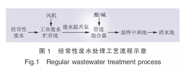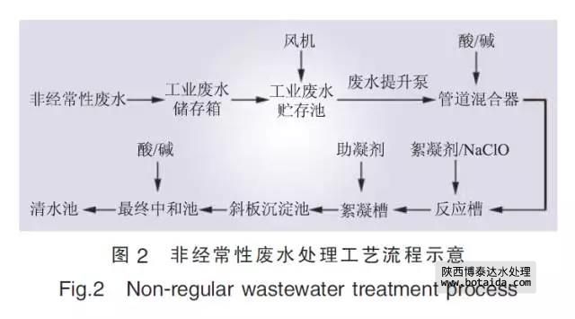 非經(jīng)常性廢水處理系統(tǒng)工藝流程如圖2所示, 調(diào)整pH值后的廢水先后經(jīng)過反應(yīng)槽、絮凝槽完成凝聚、絮凝反應(yīng), 然后進(jìn)入斜板沉淀池完成絮凝體與水的分離。沉淀池上部的清水自流進(jìn)入最終中和池進(jìn)行pH值調(diào)整, 最終出水流入清水池, 與經(jīng)常性廢水匯總。