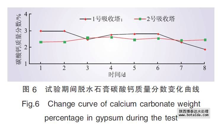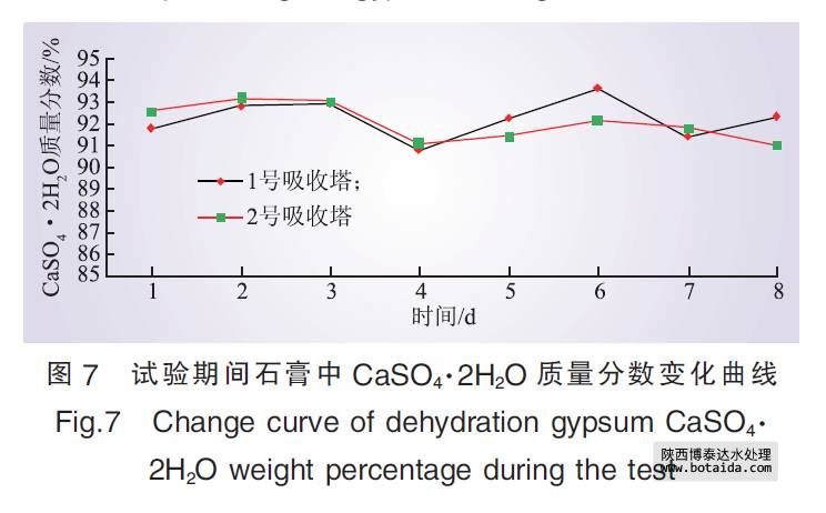 根據(jù)計劃進(jìn)行臨時管路系統(tǒng)安裝, 從原工業(yè)廢水系統(tǒng)清水池清水泵出口母管直接引出一路管道至1、2號脫硫塔間的地坑。由電廠原有的坑泵將處理后的工業(yè)廢水輸送入脫硫塔工藝用水點, 同時在管路上增設(shè)電動調(diào)節(jié)閥和電磁流量計。首次補入地坑120 m3處理后的工業(yè)廢水, 待地坑內(nèi)坑泵開啟將其輸送至脫硫系統(tǒng)后, 監(jiān)測脫硫塔脫硫效率、石膏品質(zhì)變化; 在脫硫塔脫硫效率、石膏品質(zhì)穩(wěn)定無變化的情況下, 逐步補入處理后的工業(yè)廢水, 并以10 m3/d的梯度逐漸增加。若石膏品質(zhì)明顯下降, 則加大監(jiān)測頻率, 分析原因, 同時停止補入處理后的工業(yè)廢水。在調(diào)試好相關(guān)設(shè)備和儀表后開始進(jìn)行試驗分析, 內(nèi)容包括脫硫系統(tǒng)整體運行狀況、脫硫效率、石膏品質(zhì)等。