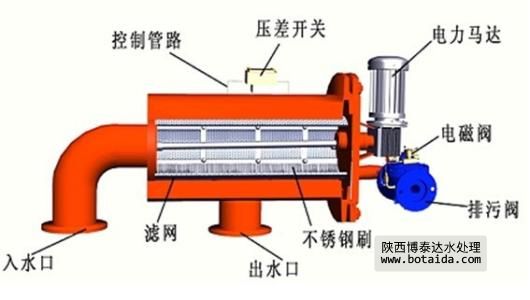 待處理的水由入水口進(jìn)入機(jī)體,水中的雜質(zhì)沉積在不銹鋼濾網(wǎng)上,由此產(chǎn)生壓差。通過壓差開關(guān)監(jiān)測(cè)進(jìn)出水口壓差變化,當(dāng)壓差達(dá)到設(shè)定值時(shí),電控器給水力控制閥、驅(qū)動(dòng)電機(jī)信號(hào),引發(fā)下列動(dòng)作:電動(dòng)機(jī)帶動(dòng)刷子旋轉(zhuǎn),對(duì)濾芯進(jìn)行清洗,同時(shí)控制閥打開進(jìn)行排污,整個(gè)清洗過程只需持續(xù)數(shù)十秒鐘,當(dāng)清洗結(jié)束時(shí),關(guān)閉控制閥,電機(jī)停止轉(zhuǎn)動(dòng),系統(tǒng)恢復(fù)至其初始狀態(tài),開始進(jìn)入下一個(gè)過濾工序。