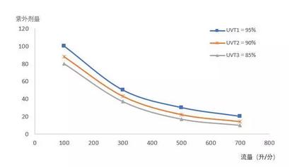 生物驗(yàn)證是通過(guò)向紫外線(xiàn)消毒系統(tǒng)加入目標(biāo)微生物,測(cè)定目標(biāo)微生物的滅活率,反推紫外設(shè)備的劑量及消毒性能的。首先,用紫外平行光儀均勻照射已知濃度的目標(biāo)微生物樣品,檢測(cè)照射后微生物濃度以確定滅活率。根據(jù)紫外強(qiáng)度、暴光時(shí)間等試驗(yàn)因素,計(jì)算微生物的紫外線(xiàn)照射劑量,最終得到目標(biāo)微生物的紫外線(xiàn)劑量-滅活率曲線(xiàn)。然后,進(jìn)行紫外線(xiàn)反應(yīng)器的測(cè)試,將驗(yàn)證微生物加入到紫外線(xiàn)消毒系統(tǒng)的上游,在確定流量、UVT、UV功率等條件下,測(cè)定目標(biāo)微生物的滅活率。根據(jù)檢測(cè)結(jié)果以及上述紫外線(xiàn)劑量-滅活率曲線(xiàn),可得在不同紫外燈輸出功率和不同紫外線(xiàn)穿透率條件下,紫外線(xiàn)水消毒設(shè)備處理流量-劑量關(guān)系曲線(xiàn),如圖1所示。圖1中UVT為水體紫外穿透率,橫坐標(biāo)為設(shè)備所處理的流量,縱坐標(biāo)為設(shè)備的實(shí)際劑量。