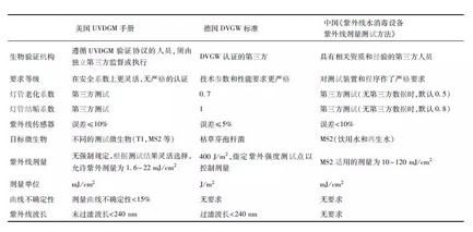 對(duì)比國(guó)內(nèi)外驗(yàn)證標(biāo)準(zhǔn),美國(guó)UVDGM手冊(cè)適用范圍相對(duì)較小。UVDGM手冊(cè)主要針對(duì)公共供水系統(tǒng)消毒,手冊(cè)中涵蓋了實(shí)施紫外線(xiàn)消毒系統(tǒng)的許多方面,但并沒(méi)有全面介紹所有類(lèi)型的紫外線(xiàn)消毒系統(tǒng)、設(shè)計(jì)替代方案以及驗(yàn)證協(xié)議。德國(guó)DVGW標(biāo)準(zhǔn)適用于所有紫外線(xiàn)殺菌設(shè)備,目標(biāo)病原體涵蓋范圍廣。中國(guó)《紫外線(xiàn)水消毒設(shè)備紫外線(xiàn)劑量測(cè)試方法》(GB/T 32092—2015)分別對(duì)飲用水、再生水和污水規(guī)范了不同的目標(biāo)微生物,涉及范圍廣。表1為國(guó)內(nèi)外驗(yàn)證標(biāo)準(zhǔn)的對(duì)比,這些規(guī)范指導(dǎo)原則不同,但都推動(dòng)了紫外線(xiàn)技術(shù)在全球范圍內(nèi)的推廣和運(yùn)用,為公共飲用水安全保障做出了貢獻(xiàn)。