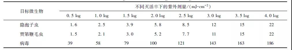 表2不同目標(biāo)微生物所需的紫外線(xiàn)劑量