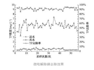 微電解除磷去除效果如下圖所示, 進水 TP 濃度為3.5~7 mg/L,平均濃度為5.64 mg/L。當(dāng)進水TP濃度為3.5~5 mg/L時,出水TP濃度穩(wěn)定于0.5 mg/L以下,達到一級A標(biāo)準(zhǔn);當(dāng)進水TP濃度在5~7 mg/L時,出水TP濃度穩(wěn)定小于1 mg/L,達一級B標(biāo)準(zhǔn);平均去除率為91.84%~95%。項目試驗結(jié)果表明,微電解除磷-砂濾技術(shù)可有穩(wěn)定高效的除磷效果,出水TP穩(wěn)定達標(biāo)。