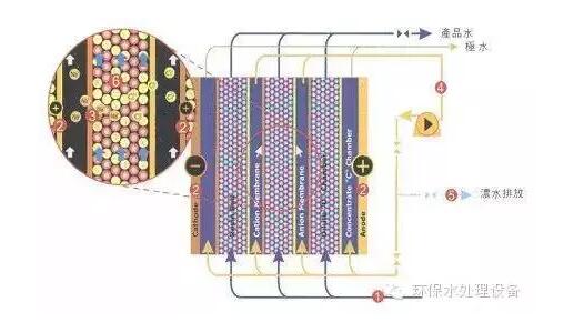 EDI裝置將給水分成三股獨立的水流:純水、濃水、和極水。純水(90%-95%)為最終得到水,濃水(5%-10%)可以再循環(huán)處理,極水(1%)排放掉。