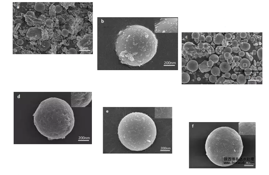 圖(e)-(g)分別是CTAB,PAM單改性和2.5gCTAB,0.05%PAM雙改性的掃描電鏡圖??梢钥闯鲈陬A(yù)處理后粗糙表面上分散吸附了部分CTAB和PAM,而并不是完全包裹,吸附的改性劑改變了粉煤灰的表面性質(zhì)。經(jīng)Zeta電位測定儀測量,原始粉煤灰的表面帶負電,Zeta電位為-10.4mV,HCl改性后Zeta電位為-21.3mV。CTAB,PAM單改性和雙改性后的粉煤灰表面帶正電,分別為+4.5mV,+6.8mV和+12.9mV,由于油分子表面帶負電荷,材料表面帶正電荷有利于油的吸附。