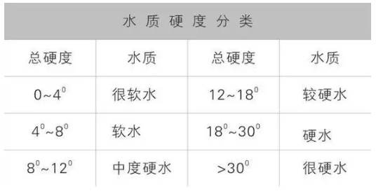 水的硬度,是指水中的鈣、鎂、鐵、鋁、錳的碳酸鹽、重碳酸鹽、氯化物、硫酸鹽及硝酸鹽等所有的鹽類的含量,并常含有汞、鎘、砷、鉛等少量的有害元素。水的硬度單位通常是將水中的全部鹽類換算為碳酸鈣來計量。當水中的硬度以碳酸鈣計小于150毫克/升時,稱為軟水;150—450毫克/升時,稱為硬水;450—714毫克/升時為高硬水;大于714毫克/升時為特硬水。國家生活飲用水硬度的衛(wèi)生標準為小于450毫克/升(以碳酸鈣計)。
